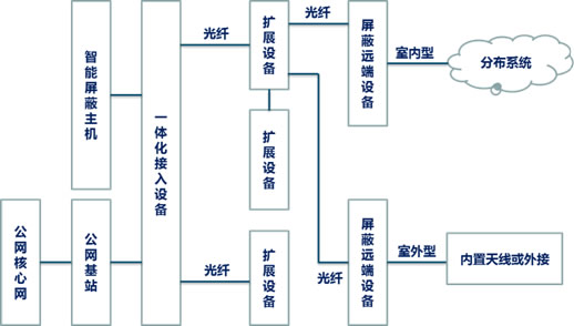 屏蔽主機(jī)獲取公網(wǎng)手機(jī)信令信息,基于自主專利技術(shù)產(chǎn)生碼干擾信號(hào),該屏蔽信號(hào)通過光纜接入到一體化接入設(shè)備
