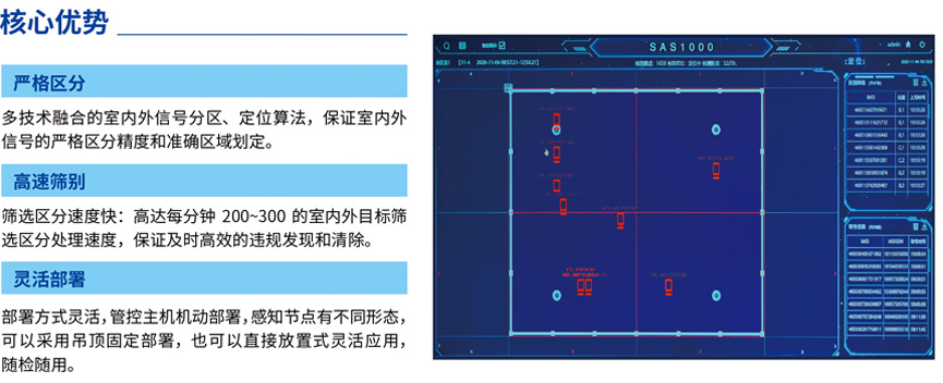 敏感場所手機(jī)精準(zhǔn)管控系統(tǒng)是針對敏感場所傳統(tǒng)手機(jī)管控設(shè)備存在漏管誤管、無法區(qū)分內(nèi)外、無法自動定位、部署不靈活等問題,從客戶需求和實(shí)戰(zhàn)應(yīng)用出發(fā),自主研制出的機(jī)動靈活、高速篩選區(qū)分、智能劃片/定位的手機(jī)管控領(lǐng)域“黑科技”產(chǎn)品。系統(tǒng)采用高速篩別處理技術(shù)、多節(jié)點(diǎn)協(xié)同定位技術(shù)以及智能管控流程,及時區(qū)分和發(fā)現(xiàn)敏感場所內(nèi)非授權(quán)手機(jī),管控其通訊行為,自動執(zhí)行目標(biāo)位置區(qū)域劃定并在后臺圖形化呈現(xiàn),快速及時掌控、清除非授權(quán)手機(jī),保障相關(guān)場所的信息安全。